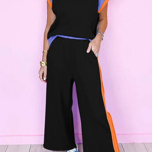 Pink Textured Sleeveless Crop Top and Wide Leg Pants Outfit